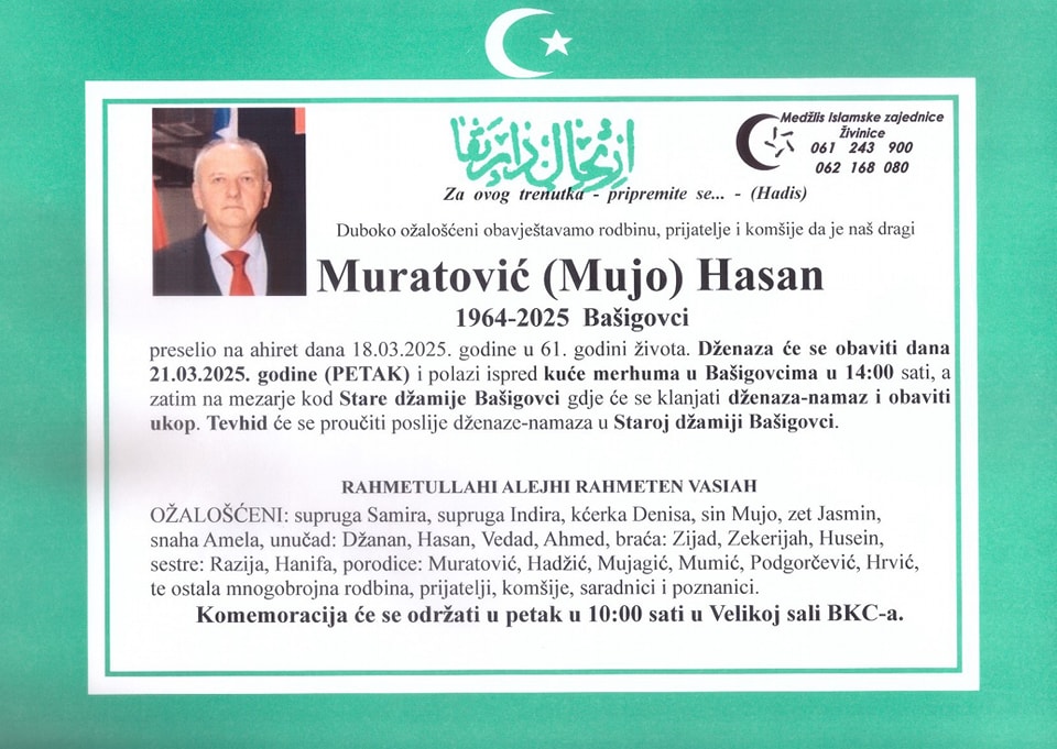 Dženaza-namaz Hasanu Muratoviću klanjat će se u petak na mezarju kod Stare džamije u Bašigovcima. Dženaza kreće ispred kuće merhuma u 14 sati.