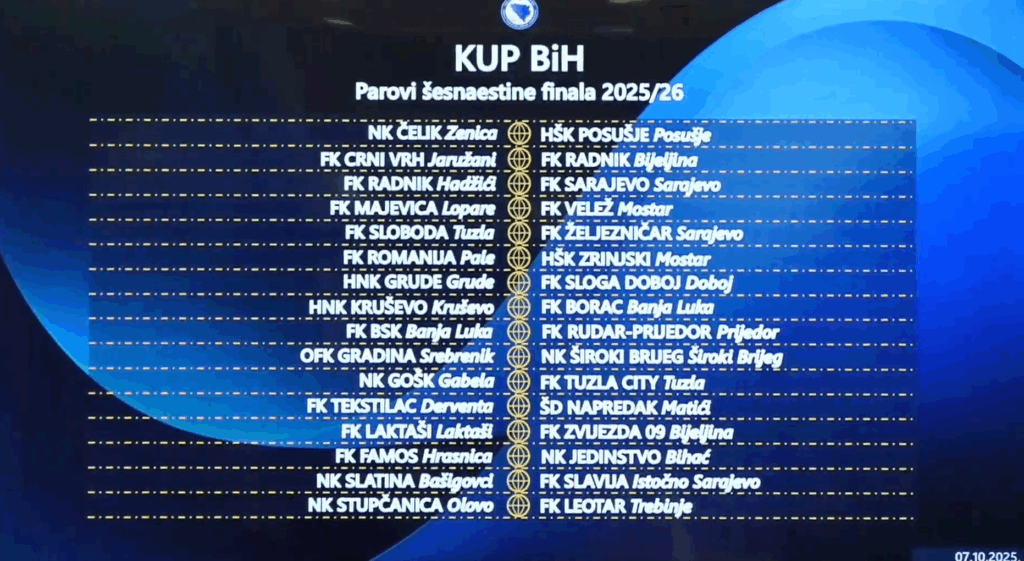 U prostorijama Nogometnog saveza BiH u Sarajevu danas je održano žrijebanje parova šesnaestine finala Kupa Bosne i Hercegovine za sezonu 2025/26.