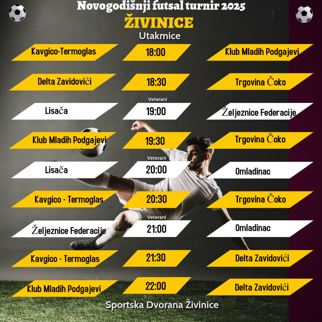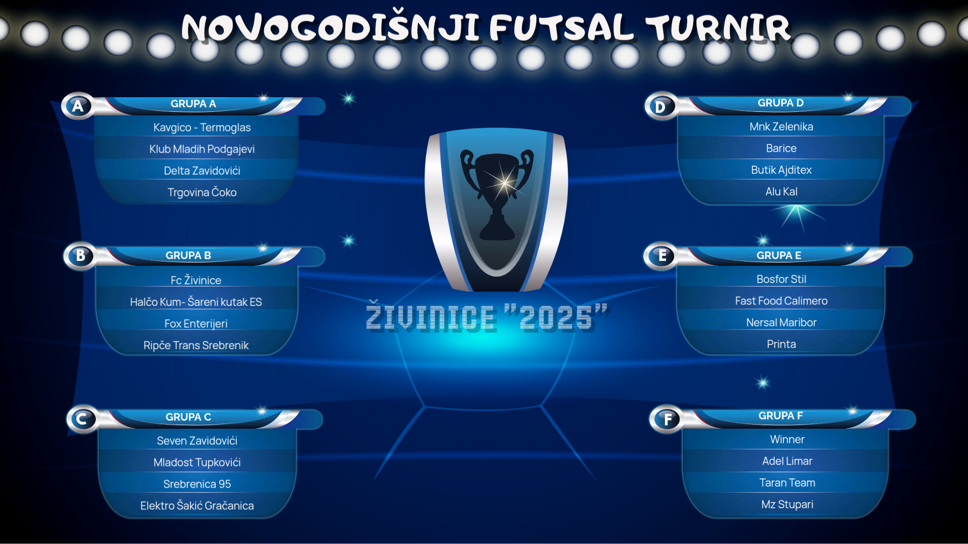 Novogodišnji futsal turnir Živinice 2025 zvanično počinje sutra (srijeda), a sve pripreme za prvu noć takmičenja su završene. Izvlačenje je obavljeno, grupe su formirane, a raspored utakmica za prvu večer turnira je poznat.