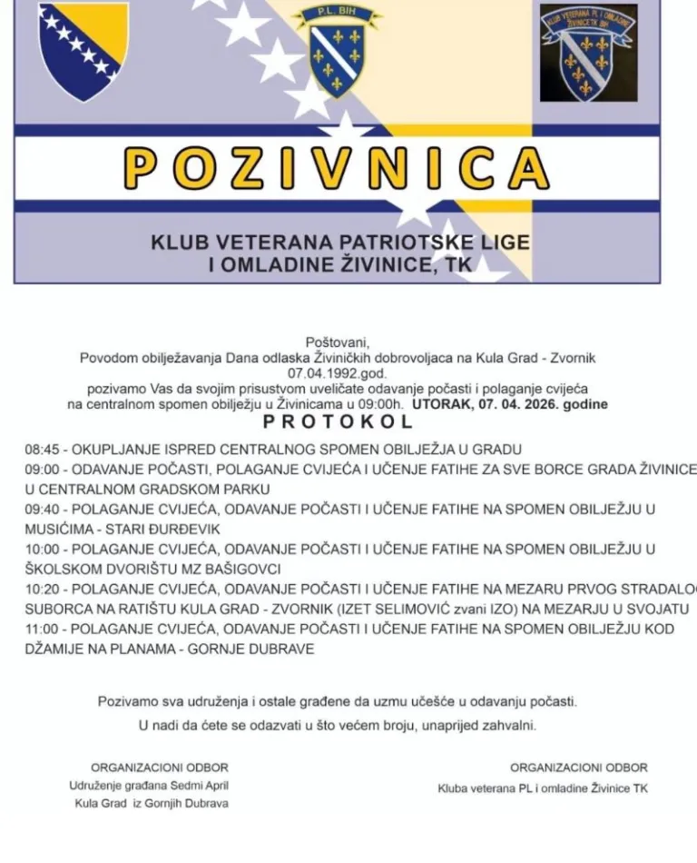 Članovi i simpatizeri Patriotske lige, ratni veterani, ali i mladi koji njeguju kulturu sjećanja na odbranu Bosne i Hercegovine, okupit će se u utorak, 7. aprila, u Živinicama povodom obilježavanja Dana odlaska dobrovoljaca na Kula Grad kod Zvornika 1992. godine.