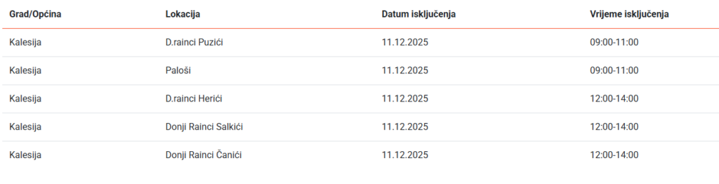 U četvrtak, 11. decembra 2025. godine, na području općine Kalesija doći će do privremenog prekida u snabdijevanju električnom energijom u pojedinim naseljima, saopćeno je iz Elektroprivrede BiH.
