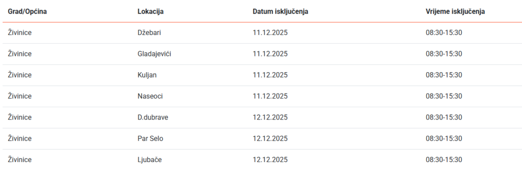 Slični prekidi najavljeni su i za više naselja na području Živinica u naredna dva dana, a odnose se na različite dijelove gradske i prigradske zone.