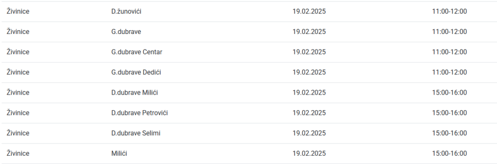 Stanovnici nekoliko naselja u Živinicama sutra (19. februar) će se suočiti s privremenim prekidima u isporuci električne energije. Planirane obustave trajat će po jedan sat, i to u sljedećim terminima: od 9:00 do 10:00, od 11:00 do 12:00 te od 15:00 do 16:00 sati.