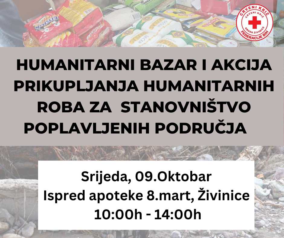 U srijedu 09.10., ispred apoteke 8.mart, održat će se humanitarni bazar i akcija prikupljanja humanitarnih roba za stanovništvo pogođeno poplavama.